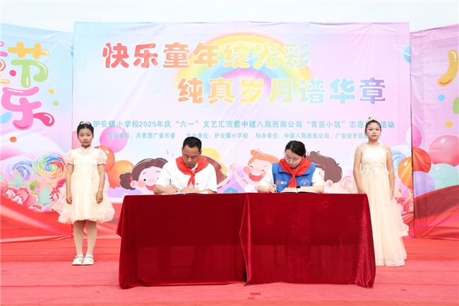 该活动由共青团广安市委,广安市护安镇小学与中建八局西南公司团委、安装分公司团委共同组织。在活动仪式上,校企双方签订了志愿服务协议,共青团广安市委志工部部长周勇为西南公司“青苗小筑”志愿服务队授旗。